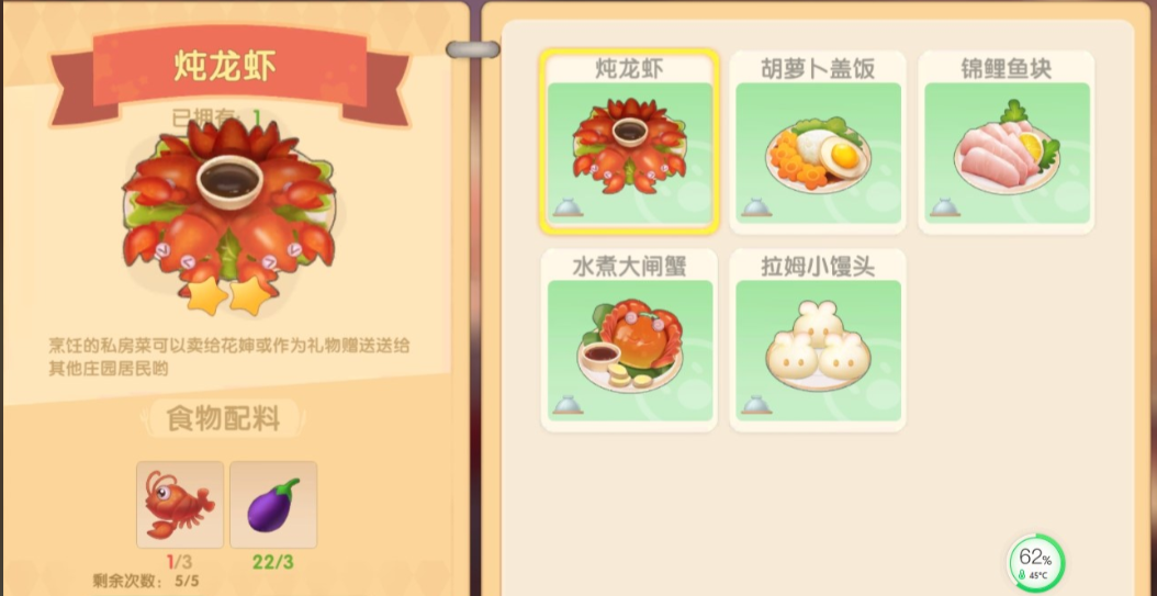 玩家需注意厨师等级限制,部分菜谱需达到指定等级才能解锁。研究时主材料必须正确,辅料错误仍能获得经验,但为了效率,建议选择正确辅料。菜谱研究可多次尝试,失败料理可出售给花婶回收少量资源。目前已公开的菜谱包括炖龙虾(小龙虾+茄子)、胡萝卜盖饭(胡萝卜+南瓜+白菜+鸡蛋)、锦鲤鱼块(锦鲤+胡萝卜)等,玩家可根据材料储备灵活选择研究方向。