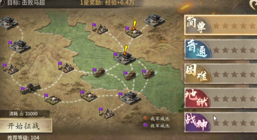 简单难度的行军路线相对直接,玩家需从渭北平原出发,依次控制武将突进至渭北、河西、潼关北,最终在潼关或五丈原拦截马超。关键在于合理分配武将行动,留一名武将控制传令兵指挥曹操移动,确保其不被马超追上。普通难度开始路线变化较大,需分兵两路,一路由典韦等强力武将在五丈原阻击马超,另一路由太史慈等武将快速攻占潼关东、渭南平原等关键节点为曹操清路。