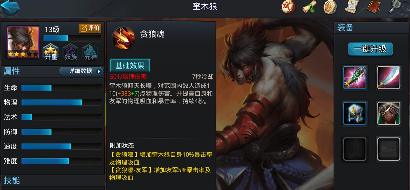 奎木狼作为乱斗西游2中的物理输出型英雄,凭借高爆发和独特的吸血机制在PVP和排行榜中占据重要地位。其核心技能包括贪狼魂、拔刀斩和追魂索命,分别提供暴击吸血、控制和大招无敌效果。贪狼魂的攻速与暴击加成是持续输出的关键,拔刀斩的击退控制需精准把握方向,而追魂索命的5段斩击配合天赋可提升至6段,在释放期间拥有无敌帧,是反杀或规避伤害的核心手段。