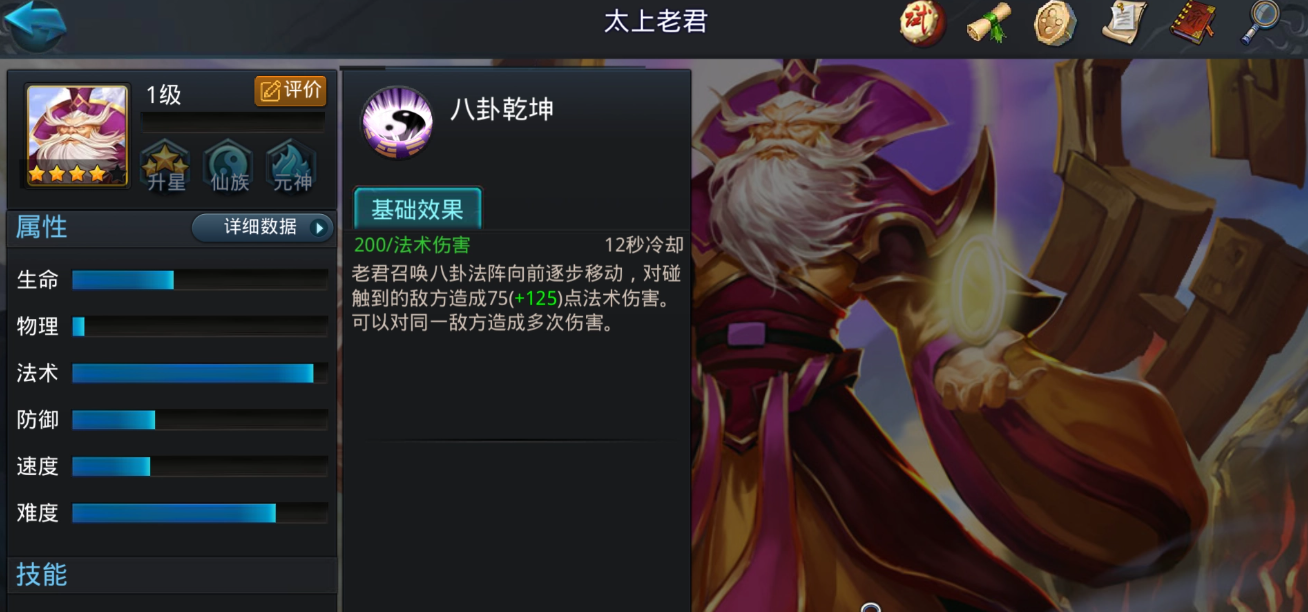 太上老君作为乱斗西游中的高爆发远程法师英雄,其核心优势在于技能连招的瞬间输出能力,但同时也存在移速慢、身板脆的短板。合理搭配装备、阵容及操作手法是发挥其威力的关键。阴阳二气作为主要输出技能,能同时释放四个法球攻击敌人,配合两仪流转的位移效果可快速切入战场,而八卦乾坤则能对直线路径上的敌人造成持续伤害,三者结合形成基础连招体系。