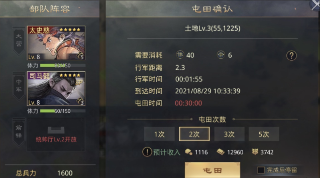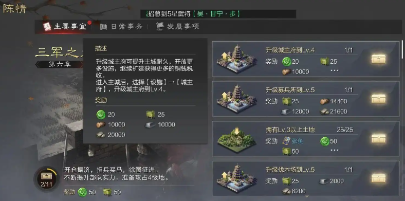 完成特定主线任务能直接触发校场升级流程,尤其是占领8块三级地的任务链,需提前规划土地扩张路径。升级校场时需确保石料和木材储备充足,通常建议各积累至少5万单位,同时检查名望值是否达到5800左右以符合升级条件。升级过程耗时较长,可使用玉符加速建造,但普通玩家应权衡优先级,将资源用于更紧急的发展需求。
