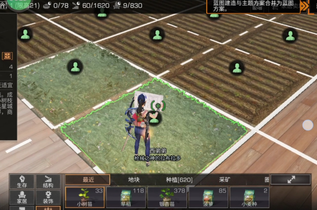 农田主要分布在安全屋附近的固定区域。安全屋是地图中央的绿色房子图标位置,周围有木栅栏围起来的可开垦泥地。走到泥地附近会触发开垦功能,每小块农田需要花费10金条解锁,总共九小块组成完整农田。开垦后就能种植基础作物,比如油菜、浆果等常见资源。记得随身携带斧头和镐子,方便清理周围障碍物。