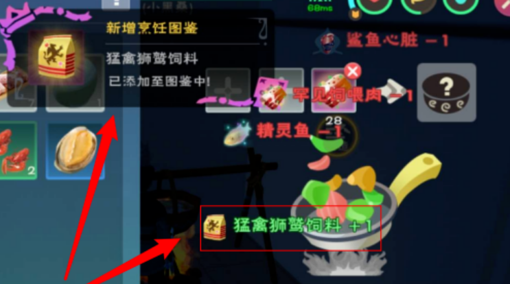 打开烹饪界面,把鲨鱼心脏、精灵鱼和罕见饲喂肉依次放进去,点击制造1个按钮就行啦。制作过程很简单,但要注意饲料的数量,建议准备110-120包比较保险,这样驯服成功率会高很多。多余的饲料可以留着下次用或者卖掉换钱。