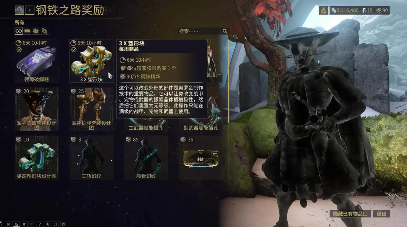 钢铁之路的奖励主要分为进度奖励和战斗掉落两大类。完成一个星球的所有节点后,你会收到泰辛赠送的25个钢铁精华和该星球的模型装饰品,这些模型可以放在轨道飞行器上展示。战斗中所有卓越者敌人都有概率掉落钢铁精华和裂罅碎银,而击杀夜灵三巨头(兆力使、巨力使、水力使)则必定掉落钢铁精华。钢铁精华能在中继站的泰辛商店兑换专属物品,包括稀有MOD、外观和实用道具。