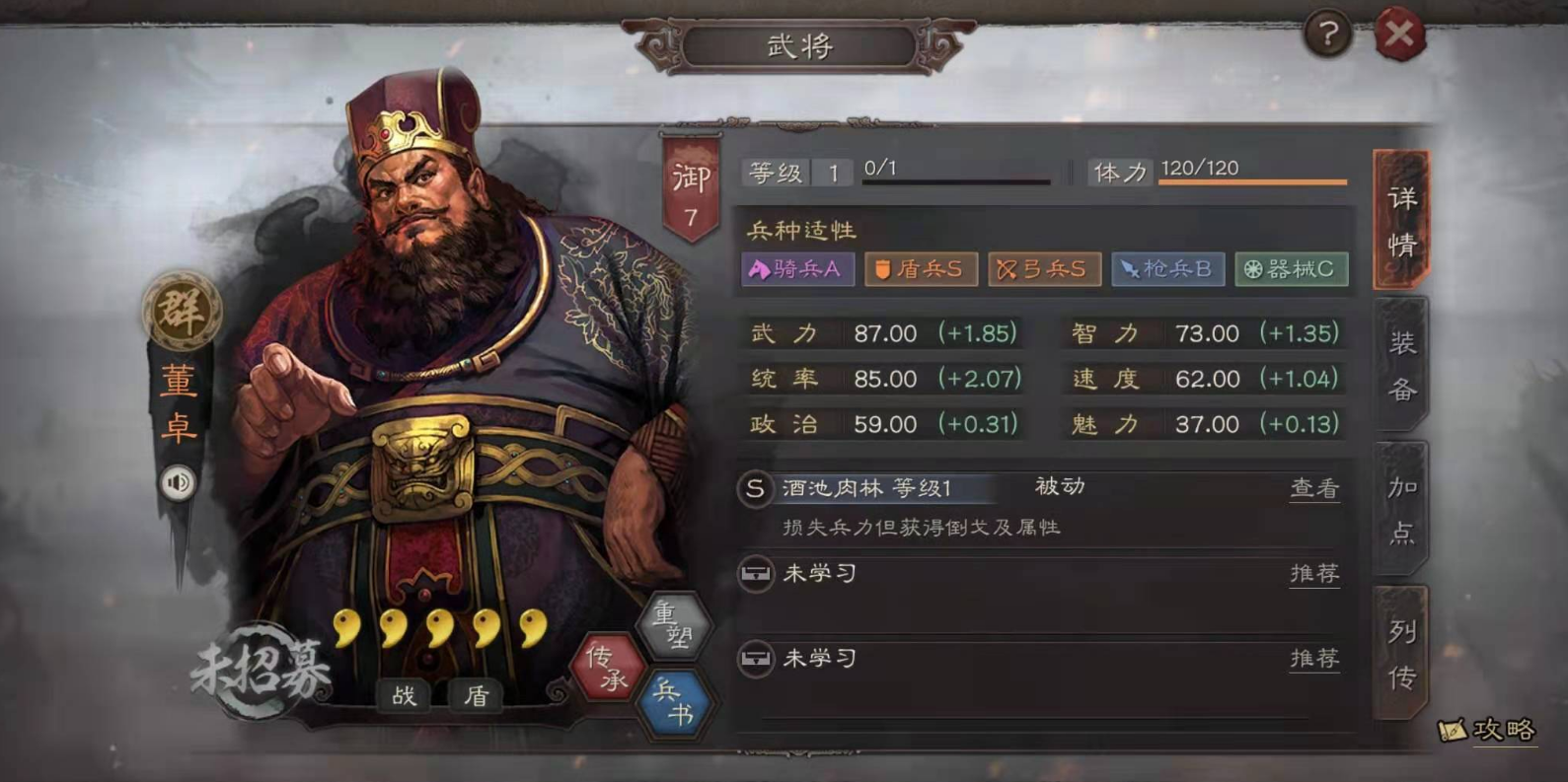 董卓在游戏中通过特定机制实现控制效果,核心在于其自带战法的属性叠加和治疗偷取能力,这不仅提升自身生存,还能间接扰乱敌方节奏。战斗中,董卓有概率偷取敌人的治疗增益,转化为自身统帅和智力的提升,使他在持久战中逐步积累优势,成为团队中的稳定控制点。这种机制特别克制依赖治疗或持续输出的阵容,如周瑜白毦兵体系,因为它能削弱敌方的恢复效率,同时强化董卓的防御和续航能力。理解这一基础是运用董卓进行有效控制的关键,玩家需优先关注其战法触发条件和叠加效果。
