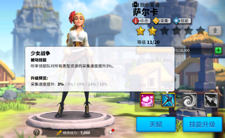 在天赋加点上,蓝色副将建议优先点满采集系,尤其是百夫长和萨尔卡。龙骑兵则可以侧重行军速度,提升扫田效率。孙武作为主将,天赋以技能和步兵为主,确保团战和驻防时的表现。蓝色副将的培养不需要投入太多资源,达到37级并点满关键天赋即可。