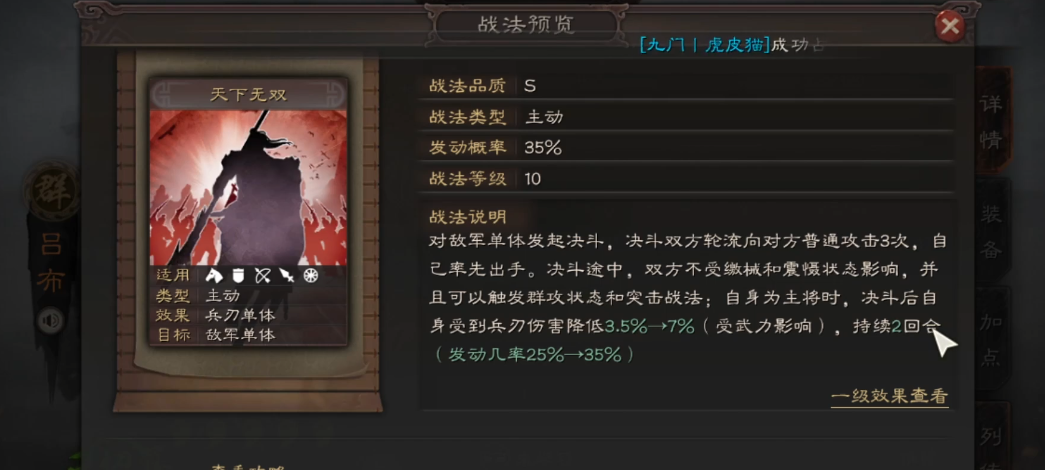 战法配置是防止暴毙的关键环节,推荐为吕布搭配抚辑军民或奇计良谋类减伤战法,这些能降低敌方高伤害武将的威胁;吕布自身战法应优先考虑快速启动的类型,如天下无双,并利用三势阵提高发动概率,以在战斗初期建立优势,避免后期疲软。避免使用众动万计等低性价比战法,转而选择气凌三军和击其惰归,前者提供反击伤害保护,后者则兼顾输出与回复,增强吕布的持续作战能力。