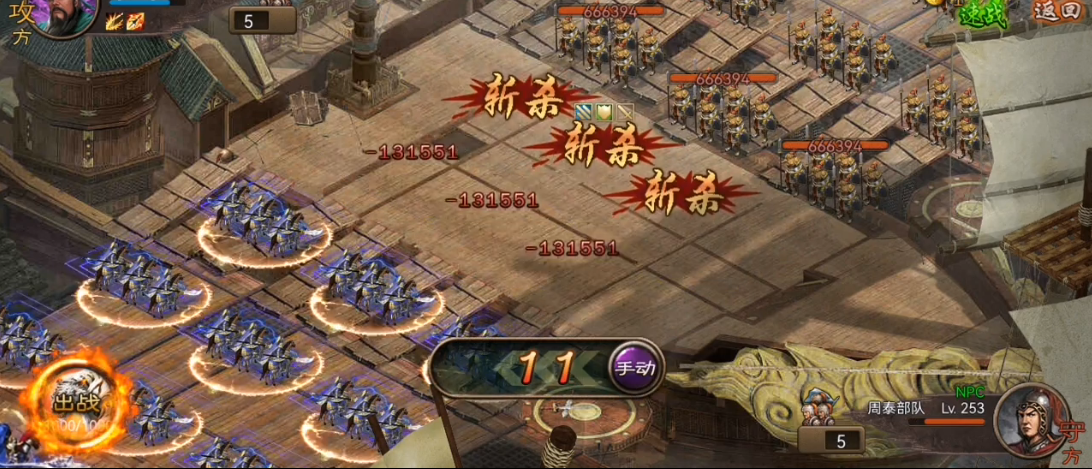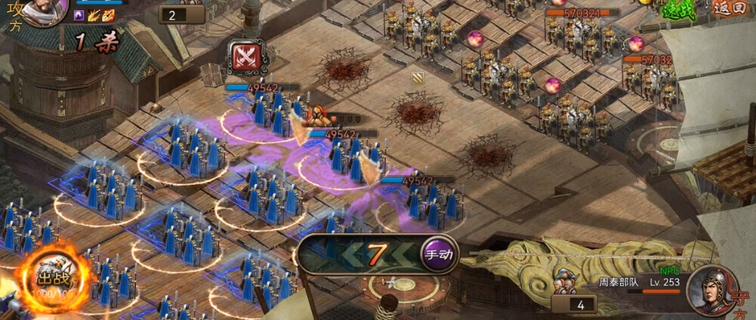 周泰的大将排常与NPC互斩同归于尽,因此需依赖其第三、四排的输出。孟获加陆逊的一车组合需确保70级阵法,保证陆逊能释放两次阵法技能。若开山旗子不足,孟德的斩杀需依赖运气,建议在资源充足时优先强化关羽与周泰的装备。