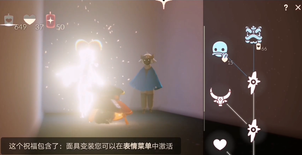 找到舞狮帽先祖后,玩家可以与其对话打开兑换界面,舞狮帽需要通过消耗蜡烛进行兑换,具体需要66根蜡烛。在兑换过程中,玩家可能需要先解锁前置节点,例如花费少量蜡烛开启路径,之后才能兑换舞狮帽本身。兑换树状图中可能还包括其他相关物品,但舞狮帽是许多玩家的主要目标,建议提前准备好足够数量的蜡烛以确保兑换顺利完成。完成兑换后,舞狮帽将添加到玩家的装扮库中,可供随时使用。