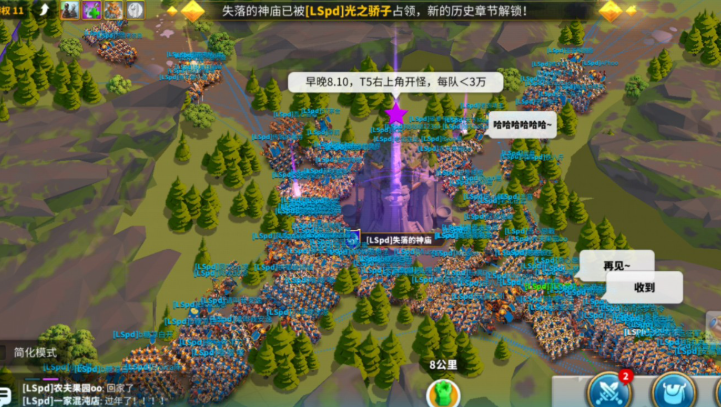 进入战斗阶段后,严格的流程控制与即时应对是关键。主力集结部队抵达Boss位置后即刻开战,未加入集结的玩家应操控部队在集结圈外围待命,随时准备填充兵力。由于神庙守军的伤害极高且具备强力的反击,必须确保集结部队的兵力始终维持在90%以上的健康水平,一旦兵力大幅下滑导致整体输出与承伤能力衰减,便极易引发溃败。需要特别警惕的是,Boss免疫所有控制效果,因此切忌使用多支队伍围殴的人海战术。战斗中将动态触发两项召唤机制:当听到亵渎神庙者,必须受到惩罚,守护者消灭他们的喊话时,意味着紫色守护者已被召唤,待命玩家需立即集火这些高威胁单位,防止其攻击主力集结部队;当听到神的光辉照耀世间,狂热者们,增援我的喊话时,表明神庙血量已进入危险阶段,橙色狂热者将从地图四角刷新。此时必须提前分派专人,使用带有减速技能的将领部队(如理查一世、曹操等)前往拦截并迅速击杀,阻止任何一名狂热者进入神庙,否则战斗将前功尽弃。