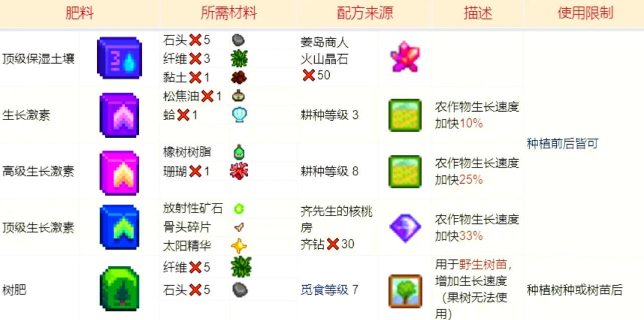 基础肥料通过木材和树叶合成,品质肥料需树脂和树液,高效能肥料需高级材料如放射性矿石。速成肥依赖钓鱼产物(鱼胶和海藻),保湿肥料则需黏土和纤维。初期建议优先制作基础肥料,中后期再转向高级肥料。制作配方需通过提升耕种等级解锁,部分稀有肥料(如晶核肥料)需通过特殊途径获取。